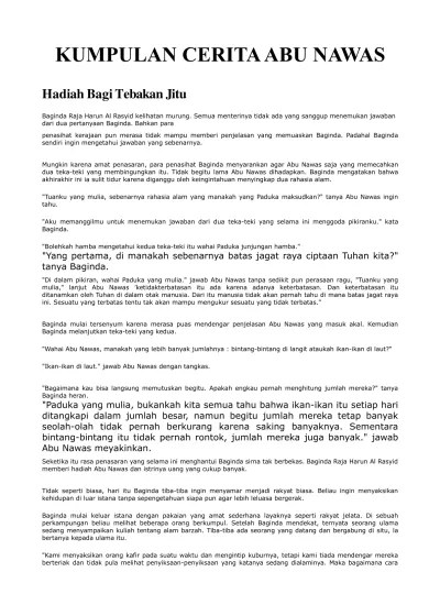 Tokoh abu nawas dikisahkan hidup pada masa pemerintahan khalifah harun al rasyid. Cerita lucu yang di kemas dengan singkat | kisah tentang abu nawas | kumpulan cerita lucu singkat yang mengisahkan tentang abu nawas. Program studi pendidikan bahasa dan sastra indonesia, jurusan pbs fkip untan. Kisah petualangan abu nawas / tira ikranegara. Muhammad asyura, chairil effendy, martono.