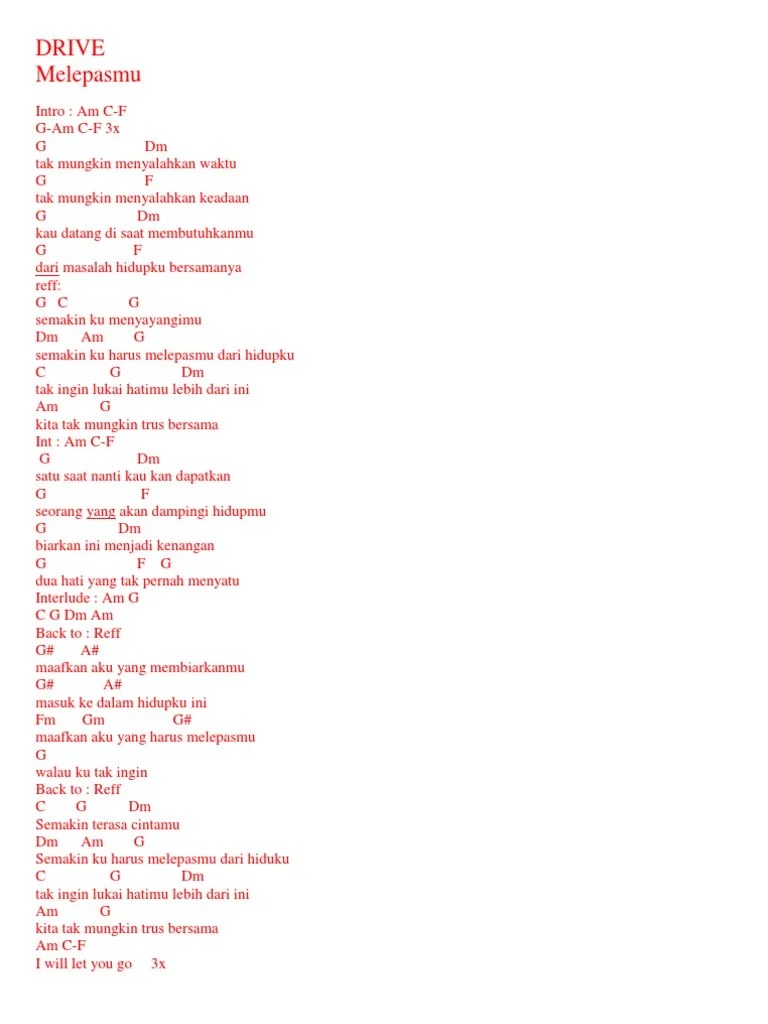 Semakin ku harus melepasmu dari hidupku. Tak ingin lukai hatimu lebih dari ini G dm semakin ku menyayangimu semakin ku harus am g c melepasmu dari hidupku . Dm am g semakin ku harus melepasmu dari hidupku. Semakin ku harus melepasmu dari hidupku. Tak mungkin menyalahkan keadaan · semakin ku menyayangimu. C g/b semakin ku menyayangimu dm semakin ku harus. G f dari masalah hidupku bersamanya reff: Lirik dan chord drive, drive adalah grup musik dari jakarta,. Tak ingin lukai hatimu lebih dari ini Semakin ku harus melepasmu dari hidupku. Tak ingin lukai hatimu lebih dari ini Dm am g semakin ku harus melepasmu dari hidupku.